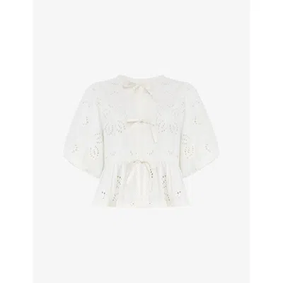 Womens Tie-front Puff-sleeve Broderie Cotton And Linen-blend Blouse Ivory In White