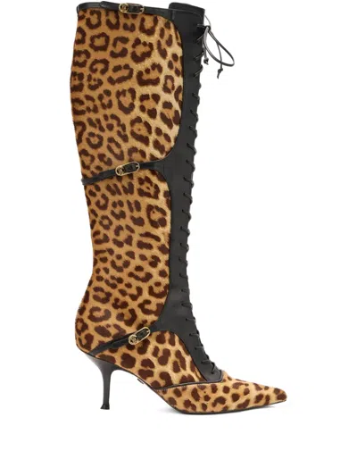 Pointed Lace-up Boots With Leopard Skin In Animal Print