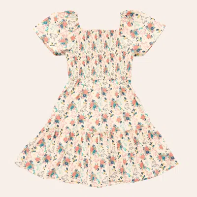 Girls' Multicolor Horse & Floral Print Ruffled Cap Sleeve Dress In White