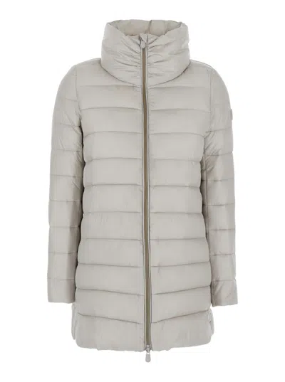Lydia Beige Down Jacket With High Neck And Logo Patch On The Sleeve In Tech Fabric Woman In Gray
