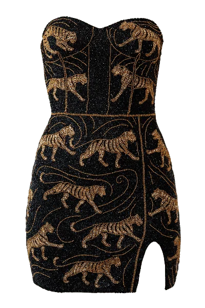 Women's Black / Gold Tiger Hand-beaded Embellished Mini Dress In Multi