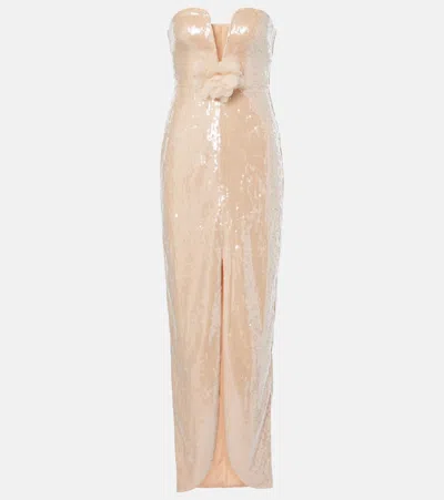Champagne Rhinestone Stretch Tulle Maxi Dress In Neutral