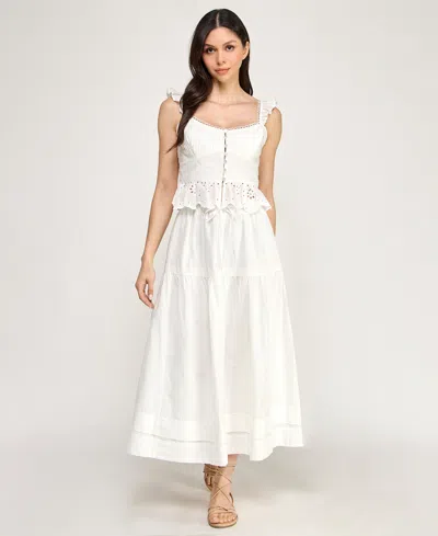Juniors' Button Up Eyelet Top & Midi Skirt, 2-piece Set In White