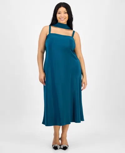 Trendy Plus Size Satin Scarf Midi Dress In Blue