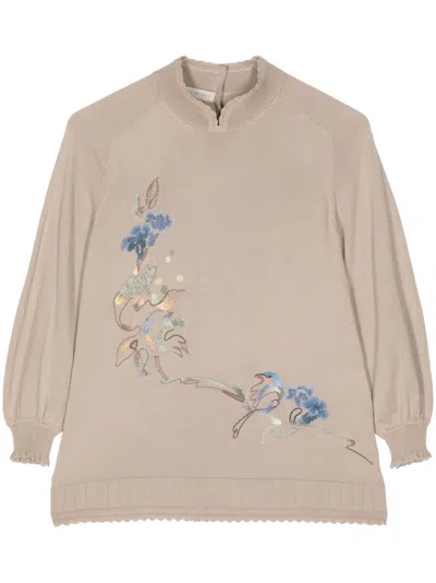 Floral-embroidered Split-neck Jumper In Brown