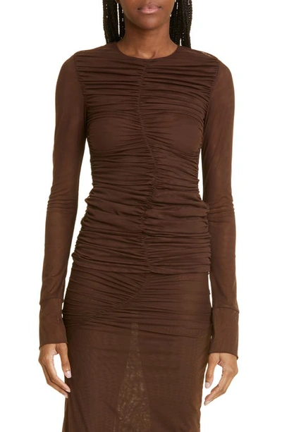 Jacques Ruched Long Sleeve Mesh Top In Chocolate