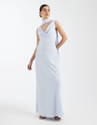 Bridesmaid Crepe Asymmetric Cowl Neck Maxi Dress In Blue