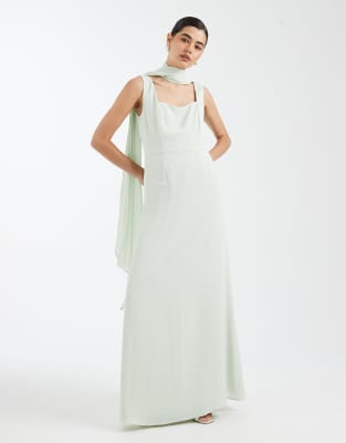 Bridesmaid Crepe Square Neck Maxi Dress With Scarf Neck In Green