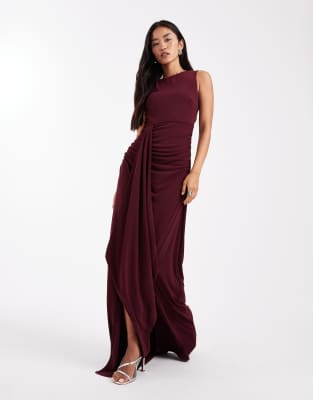 Bridesmaids Stretch High Neck Sleeveless Maxi Dress With Ruched Front In Burgundy