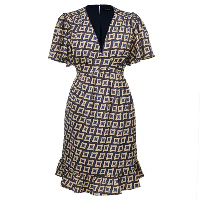 Women's Purple / Blue Italian Collar Wrap Belt Printed Dress - Navy And Purple In Black