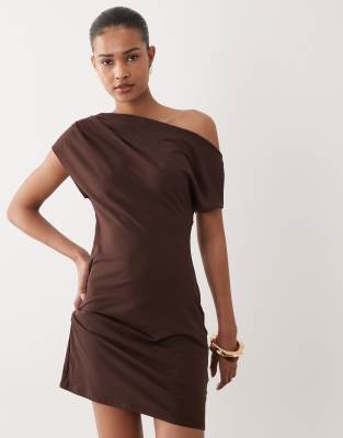 Ruched Detail Asymmetric Shoulder Mini Dress In Brown