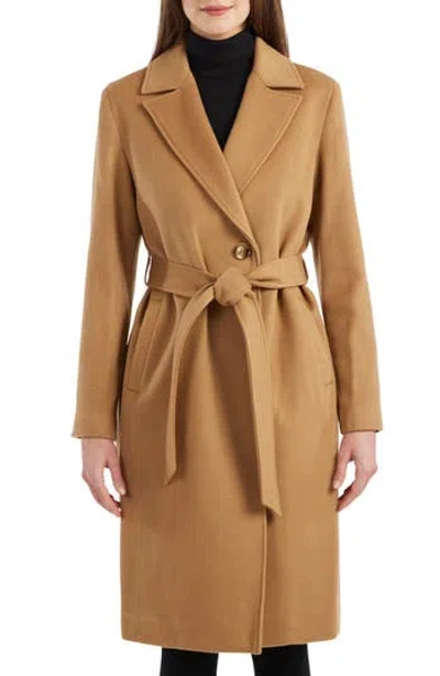Belted Genuine Shearling Trim Coat In Camel