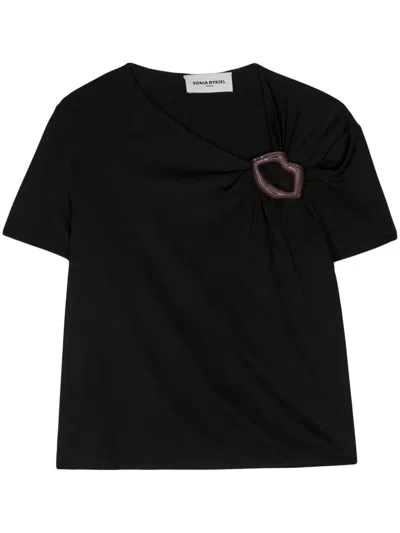 Sonia Rykiel is a French fashion designer. At the age of 17, she was employed to dress the window displays in a Parisian textile store. In 1953, Sonia married Sam Rykiel, owner of a boutique selling elegant clothing. In 1962, unable to find soft sweaters to wear during her pregnancy, she used one of her husband's suppliers from Venice to design her own sweaters. Since then, she has continued to experiment to expand her offerings. She later became the first designer to put seams on the outside of a garment, and to print words on her sweaters. In particular, she favours long clinging sweaters or small cropped pullovers, large rolled-back cuffs and long shawls. Her color palette usually features beige, grey, dark blue, and charcoal.