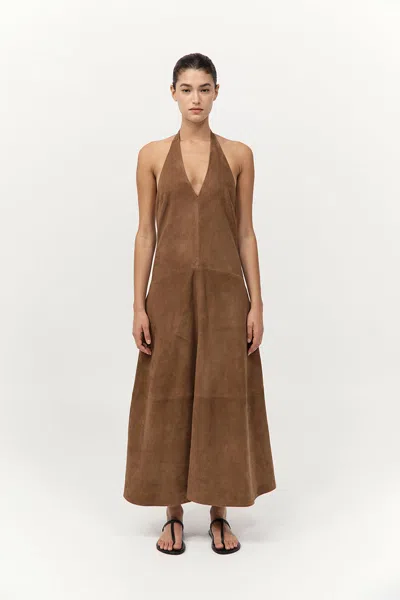 Paneled Suede Halterneck Maxi Dress In Brown