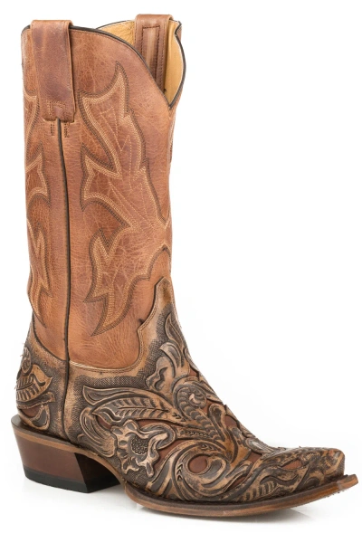 Pre-owned Mens Brown Leather Hand Tooled Wicks Cowboy Boots