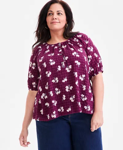 Plus Size Floral-print Puff-sleeve Top In Red
