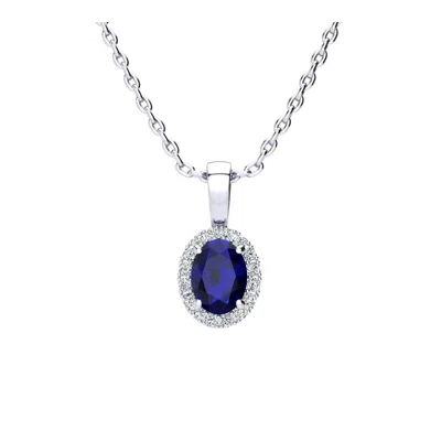 1 Carat Oval Shape Gemstone And Halo Diamond Necklace In Sterling Silver With 18 Inch Chain In Blue