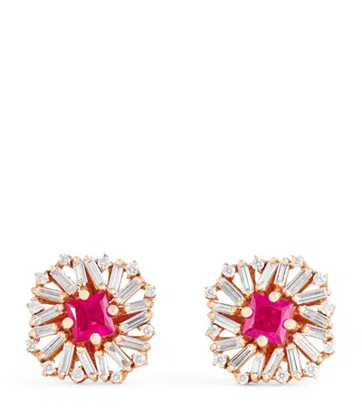 Rose Gold, Diamond And Ruby Princess Stud Earrings In Pink
