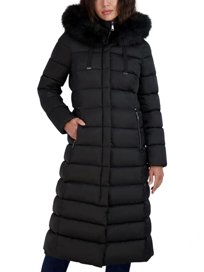 Womens Maxi Shine Bibbed Faux-fur-trimmed Hooded Puffer Coat In Black