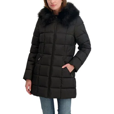 Womens Velvet Bibbed Faux-fur Hooded Puffer Coat In Black