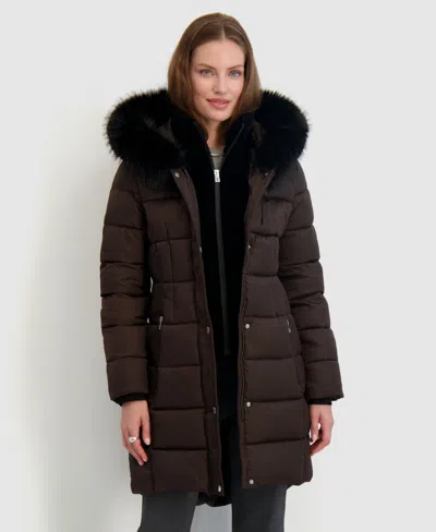 Womens Velvet Bibbed Faux-fur Hooded Puffer Coat In Brown