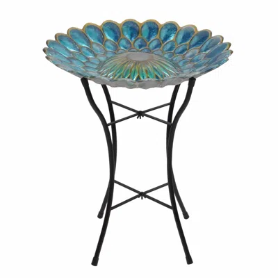 Home 18" Outdoor Solar Glass Flower Mosaic Birdbath With Led Lights And Stand In Blue