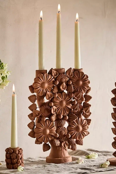 Oaxacan Clay Floral Tall Taper Holder In Brown