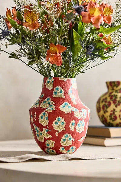 Patterned Papier Mache Bud Vase, Reds, Blues + Neutrals