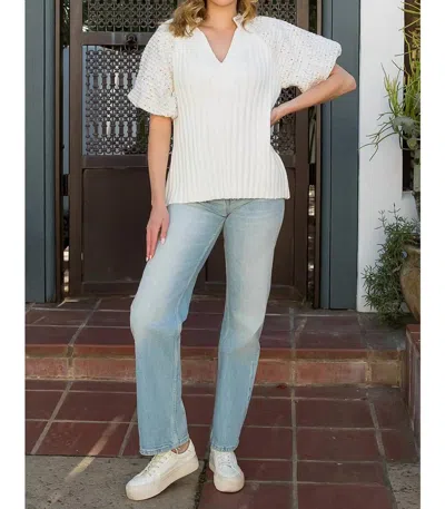 Embroidered V-neck Puff Sleeve Top In Light Blue Denim