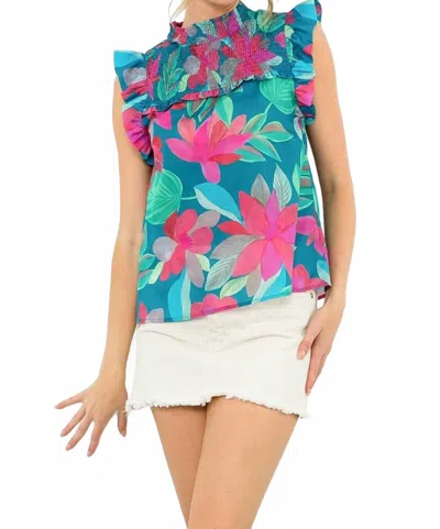 Joyce Ruffle Sleeve Smocked Top In Teal In Blue