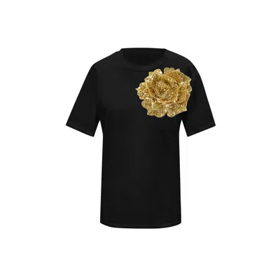 Women's Black / Gold Flower Summer Holiday Black Cotton T-shirt With Top Side Gold Sequin Rose In Multi