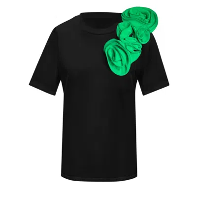 Women's Black / Green Flower Summer Black Cotton T-shirt With Green Central Roses