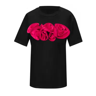 Women's Black / Pink / Purple Flower Summer Black Cotton T-shirt With Pink Central Rose