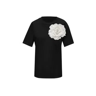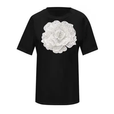 Women's Black / White Flower Summer Holiday Black Cotton T-shirt With Top Side White Sequin Rose In Multi