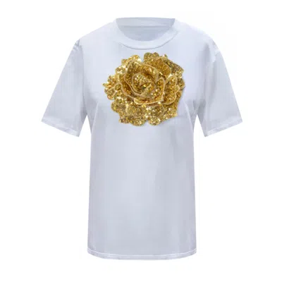 Women's Gold / White Flower Summer White Cotton T-shirt With Gold Central Sequin Rose