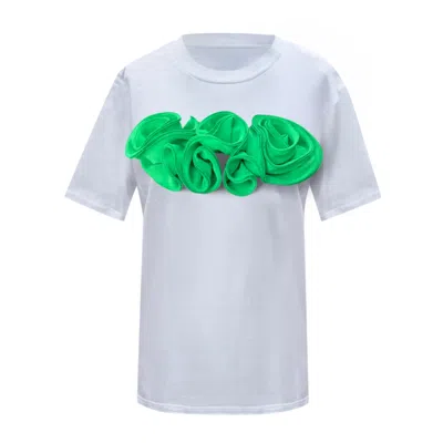 Women's Green / White Flower White Cotton T-shirt With Top Side Green Sequin Rose In Multi