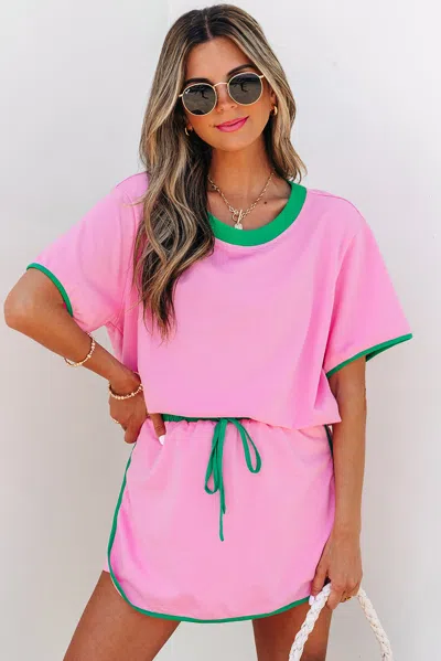 Colorblock Edge Drop Shoulder T Shirt And Skort 2pcs Set In Pink