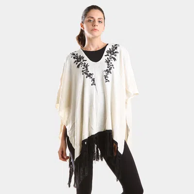 Embroidered Flower Vine & Tassel Poncho Sweater In Neutral