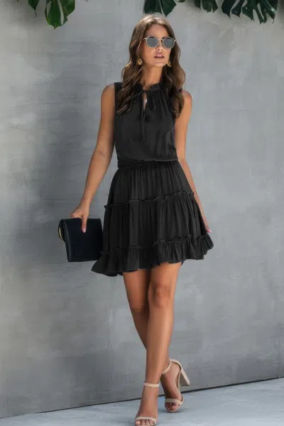 Sleeveless Tie Neck Frill Trim Tiered Layer Dress In Black