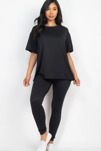 Solid Corded Knit Short Sleeve T Shirt And Wide Leg Pants Set In Green