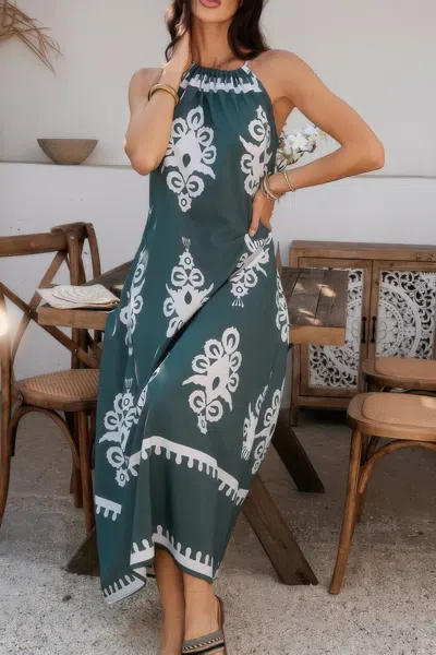Geo Print Halter Sleeveless Loose Fit Dress In Green