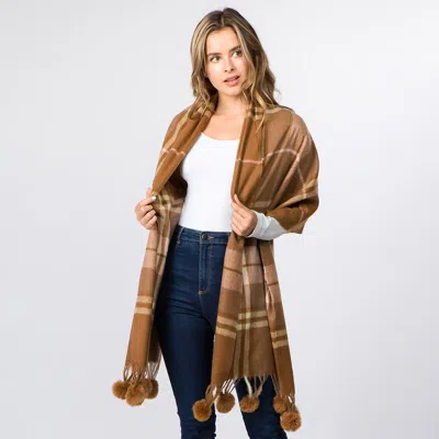 Faux Fur Pom Pom Tassel Plaid Scarf In Multi