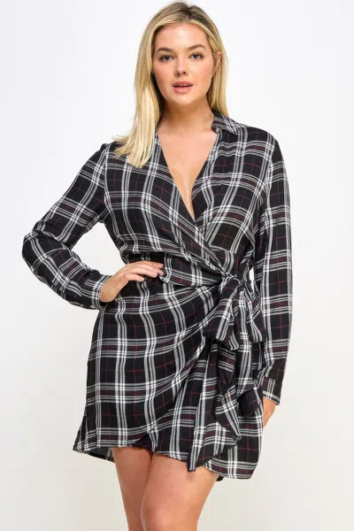 Plus Size Long Sleeve Plaid Side Tie Dress In Black