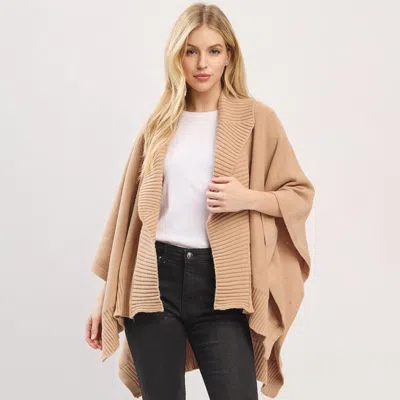 Ribbed Trim Open Front Soft Knit Shawl Cape Poncho In Brown