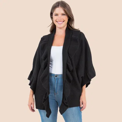 Solid Ruffle Accent Kimono Poncho In Black