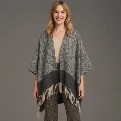Leopard Print Open Front Fringe Hem Kimono Poncho In Gray