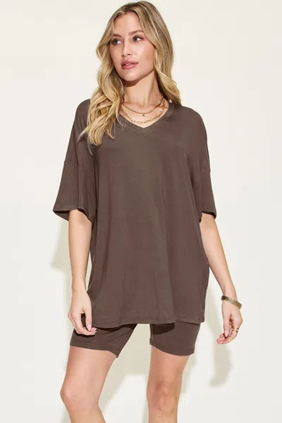 Full Size V-neck Drop Shoulder T-shirt And Shorts Set In Brown