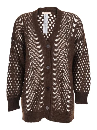 Brown V-neck Cardigan With Open Knit Design In Mohair And Wool Blend Woman