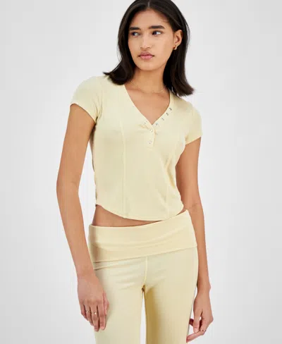 Juniors' Ribbed Cropped Henley Short Sleeve In Banana Crepe