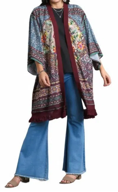 Open Front Print Kimono In Maroon Mix Plus In Multi